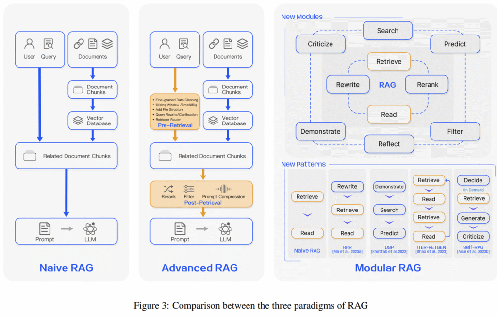 RAG的研究范式一直在持续演进,我们将其发展过程分为三个阶段:朴素RAG(Naive RAG)、高级RAG(Advanced RAG)和模块化RAG(Modular RAG),如图所示