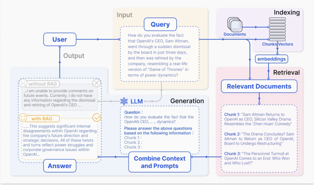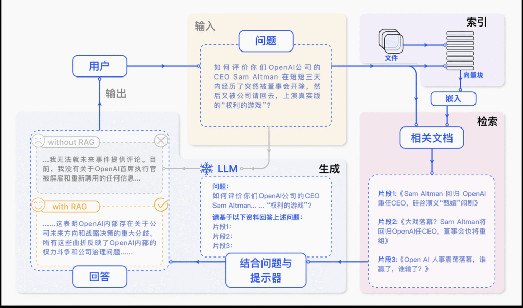 - 举例: 我想询问LLM有关于我公司内部的请假流程它肯定不知道,但是我把公司的员工手册先给它看,当我在询问的时候他就会知道