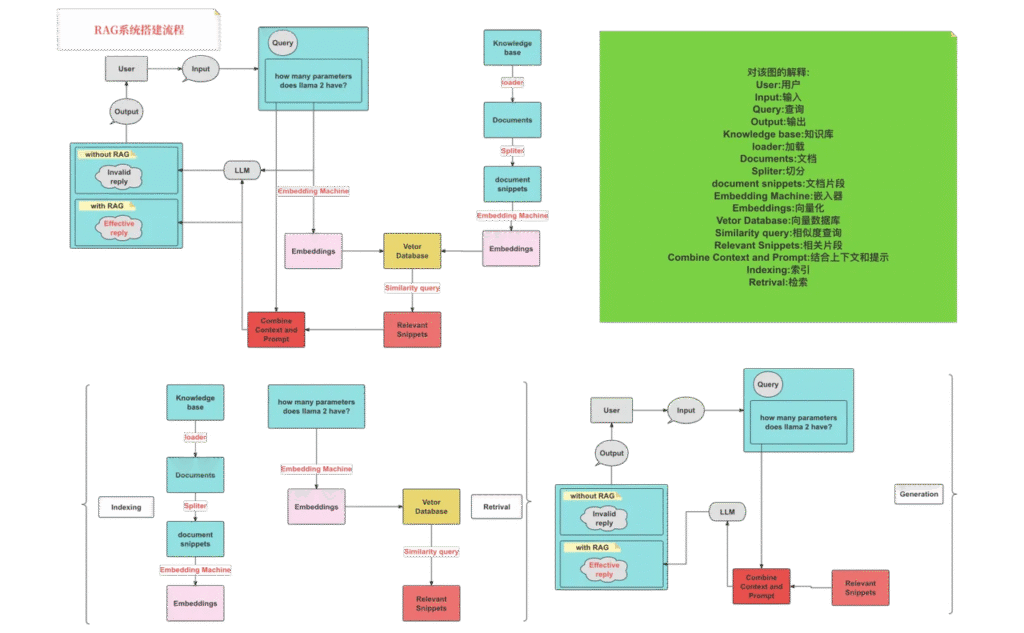 - 生成:将原始问题和检索得到的“块”都作为LLM的输入,令其生成最终的回答。
