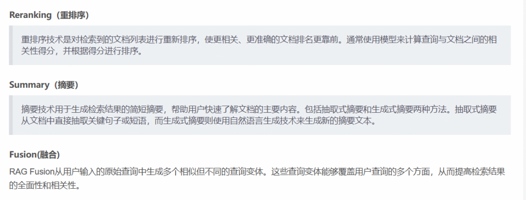 - 查询过程: 用户提交问题 –> 查询重写器对问题进行重新表述 –> 检索器去数据库检索相关内容 –> 对检索的块进行重排生成列表 –> 合并整理列表中的块 –> 读取合并之后的块 –> 生成响应返回给用户