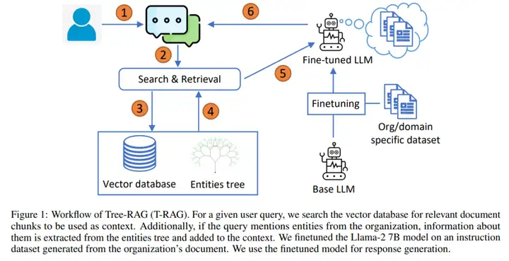 - 方法:应用程序结合了检索增强生成(RAG)和微调的开源 LLM,将其称之为 Tree-RAG(T-RAG)。T-RAG 使用树结构来表示组织内的实体层次结构,用于生成文本描述,以增强对组织层次结构内的实体进行查询时的上下文。