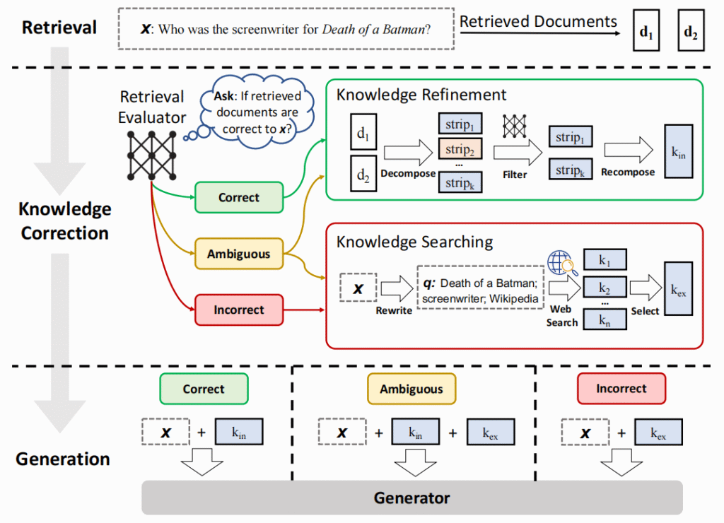 - Knowledge Correction 阶段: 这里引入了一个轻量级的 Retrieval Evaluator 来评估检索到的 docs 与 user query 之间的相关性分数,并根据这个相关性分数,触发三种 action —— Correct、Incorrect 和 Ambiguous: